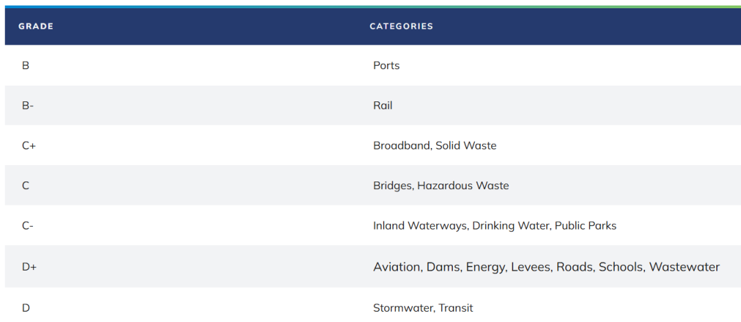 2025年,美国土木工程师协会官网给不同类别的基建打分