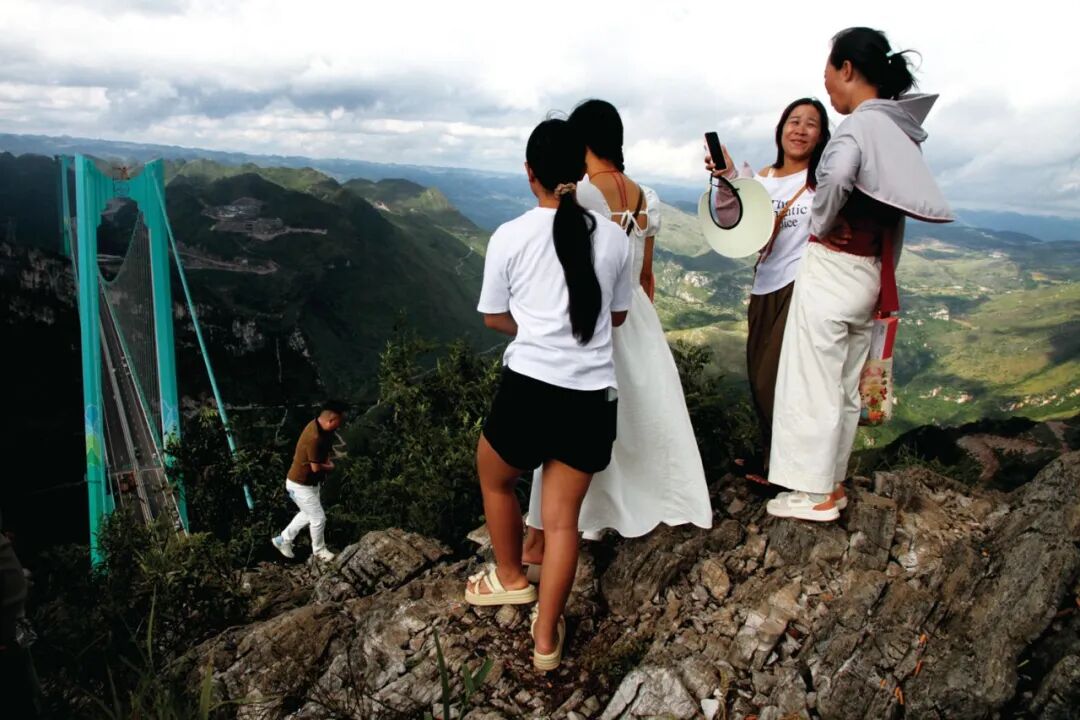 花江峡谷大桥所在地关岭自治县科力寨的村民带领外地亲友参观花江峡谷大桥 / 肖郎平 摄