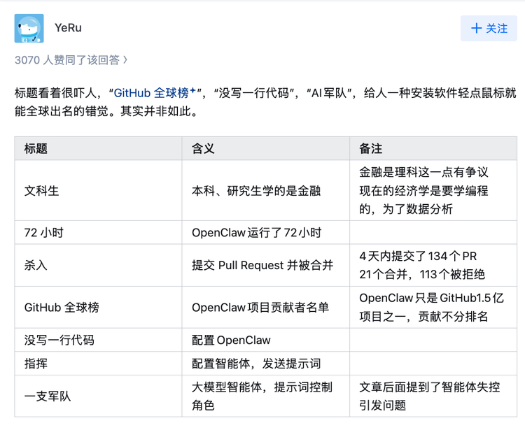 以及,批评也进一步点出,杨天润的公司正在开发多智能体平台,围绕这次事件的报道恰好从“文科生逆袭”平滑过渡到了他的产品理念。批评者据此认为,这是一条完整的营销链路:用AI批量刷PR,登上榜单,获得一个传播力极强的故事,最终指向自家产品。OpenClaw的贡献者榜单成了一块免费的背书跳板,社区维护者在不知情的情况下为别人的商业叙事买了单。