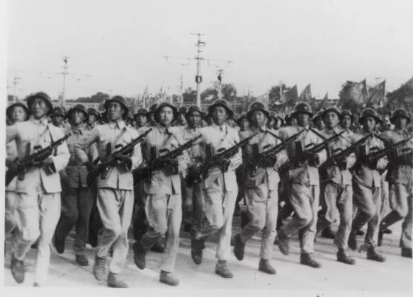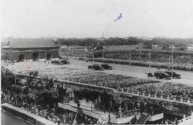 参加开国大典的受阅部队人员总计约1.64万名,代表着当时全军500万部队。阅兵式上,最先接受检阅的是海军分队,他们以“八一”军旗为前导,英姿勃勃地通过天安门主席台。紧接着的是多兵种的陆军部队,包括步兵、炮兵、战车、骑兵等兵种,他们在《八路军进行曲》《坦克进行曲》《骑兵进行曲》等伴奏下,队列整齐,精神抖擞,雄赳赳、气昂昂地接受着祖国和人民的检阅。当陆军战车师行进到天安门时,空军飞机以三机和双机为编队,依次飞经天安门广场上空。一时间,天上地面,相互交映,形成雄伟的立体武装阵容。