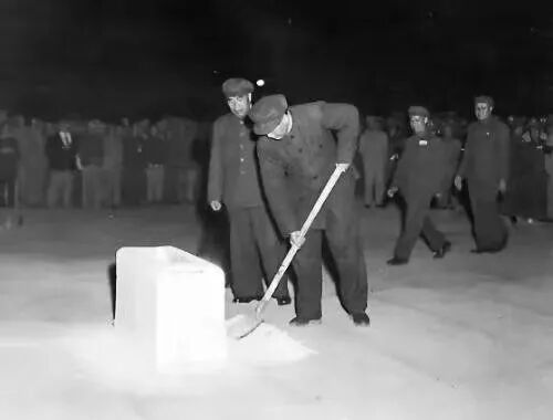 1949年9月30日下午,政协第一届全体会议闭幕后,为了追念一百多年来为新中国的诞生而英勇献身的人民英雄们,毛泽东等领导同志和参加会议的代表们从中南海怀仁堂出发,来到天安门广场,为人民英雄纪念碑举行了隆重的奠基典礼。